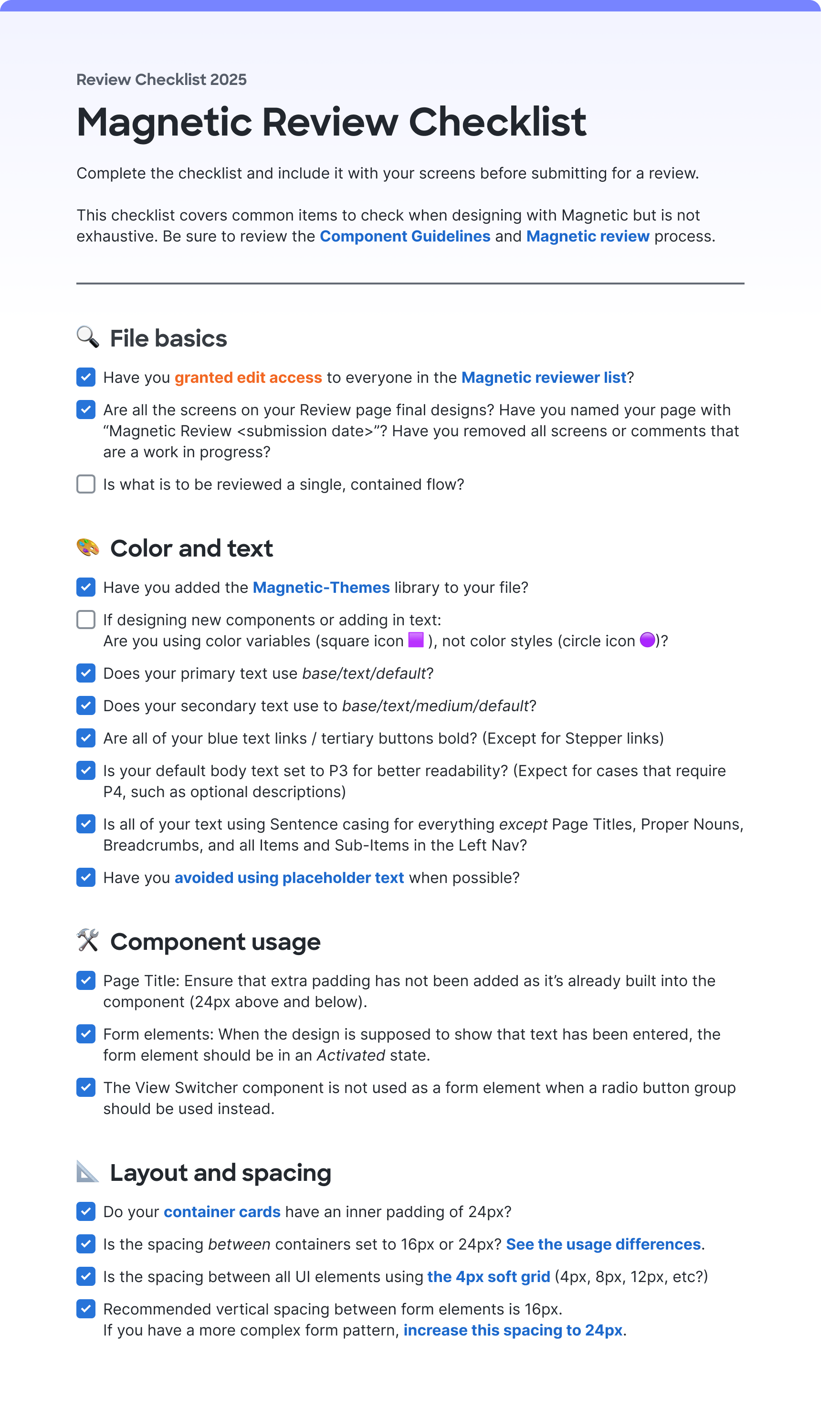 To make things easier, the design system team usually gives a checklist (like the Magnetic Review Checklist)